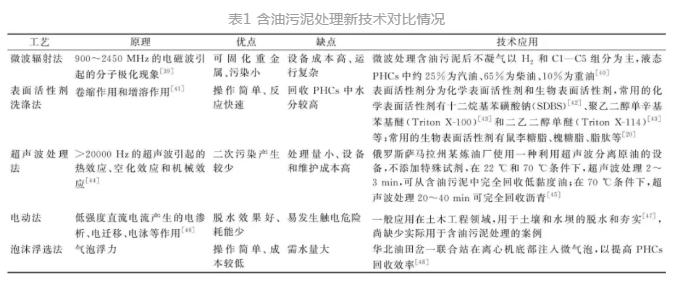其他技術(shù)主要包括微波輻射法、表面活性劑洗滌法、超聲波處理法、電動(dòng)法、泡沫浮選法等,尚處于實(shí)驗(yàn)室研究階段,具體對比情況見表1。